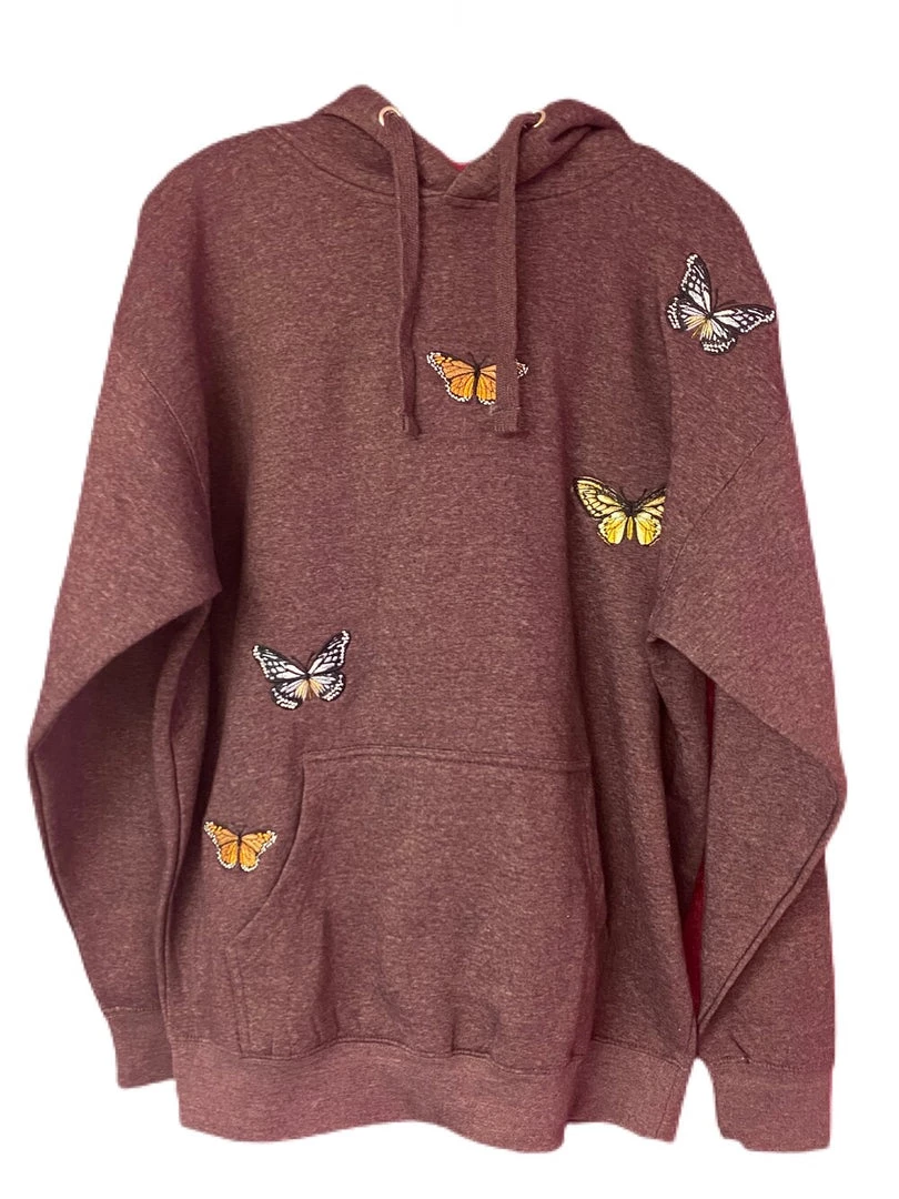 This hoodie is for the daring + fun. The butterflies are machine embroidered and perfectly placed on the hoodie front. The embroidery is done in house by the Brittany Allen team.