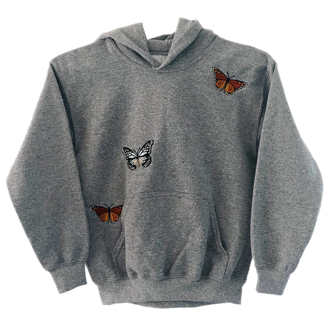 This kid’s hoodie is for the daring + fun. The butterflies are machine embroidered and perfectly placed on the hoodie front. Hoodie is a soft gray cotton. The artwork is done in house by the Brittany Allen team.
