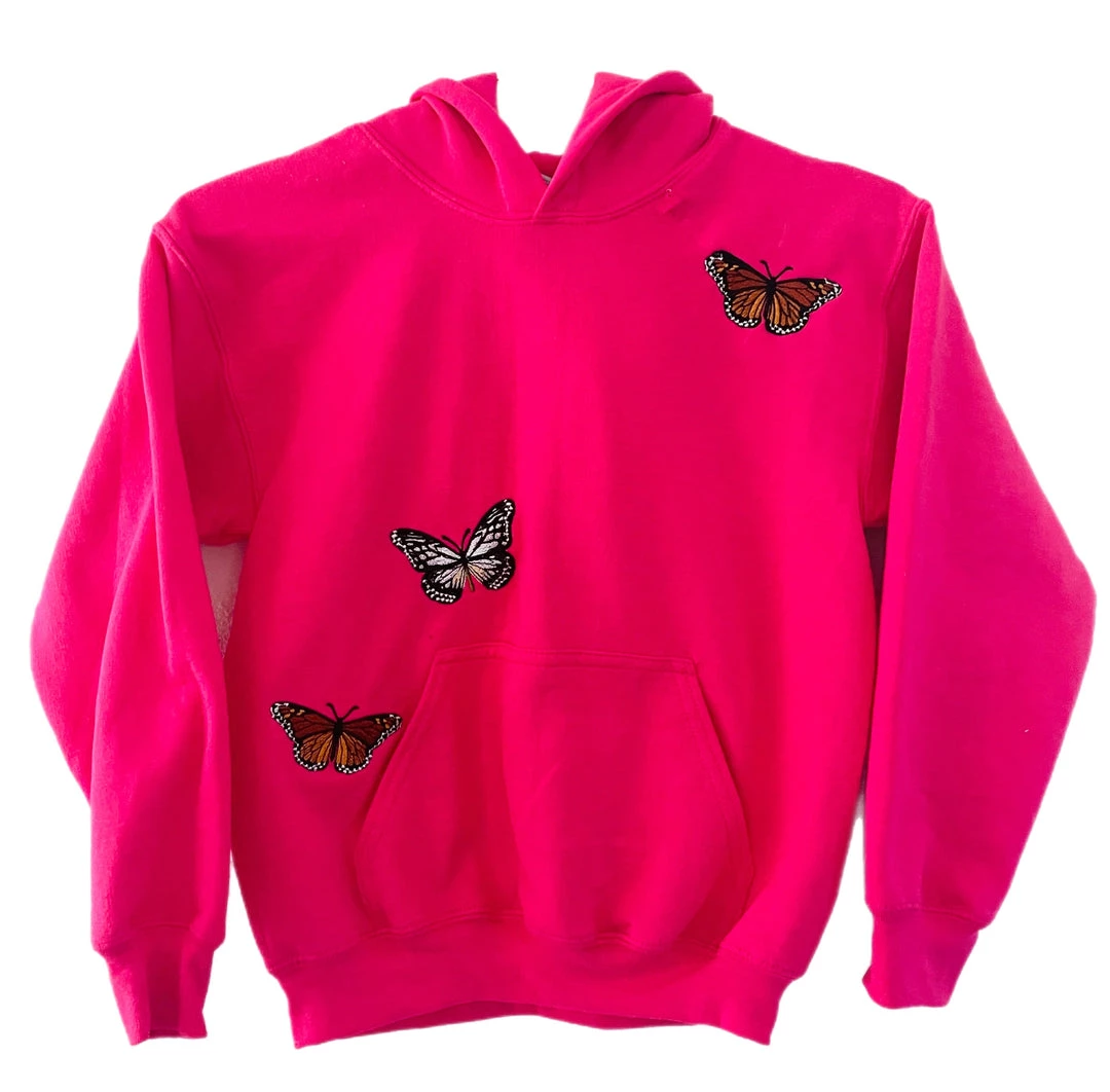 This kid’s hoodie is for the daring + fun. The butterflies are machine embroidered and perfectly placed on the hoodie front. Hoodie is a soft gray cotton. The artwork is done in house by the Brittany Allen team.